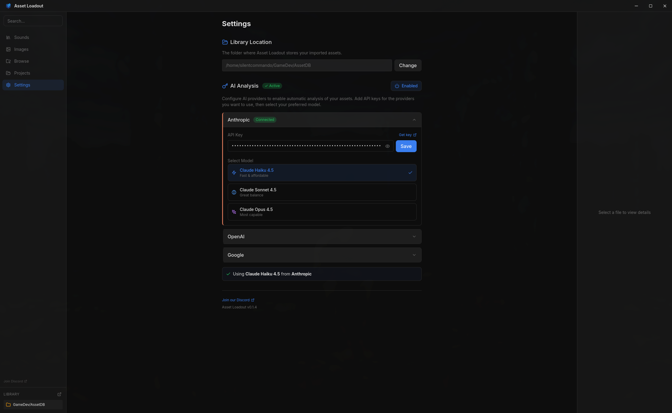 Asset Loadout uses AI to analyze and organize your assets. You'll need an API key from one of these providers: