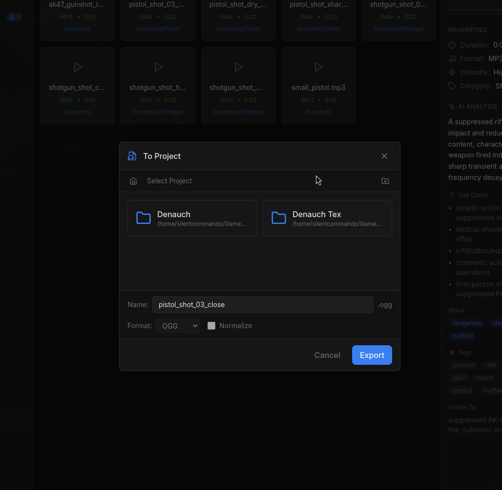 Export optimized assets directly to your Unity, Unreal, Godot, or custom game project folder. Search your library, find what you need, and export with format conversion in one flow.