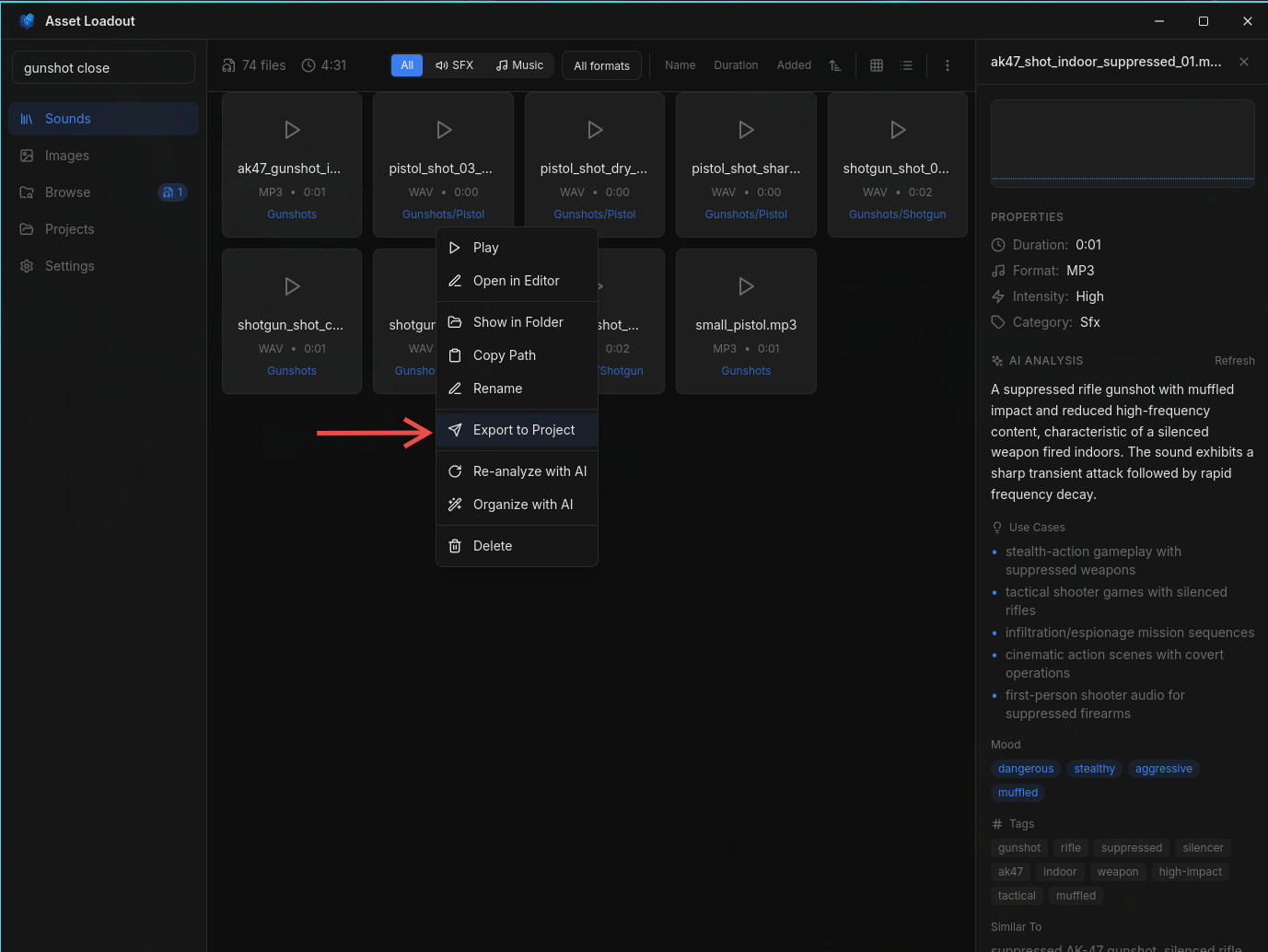 Full export workflow: search, right-click, configure, and export to your project