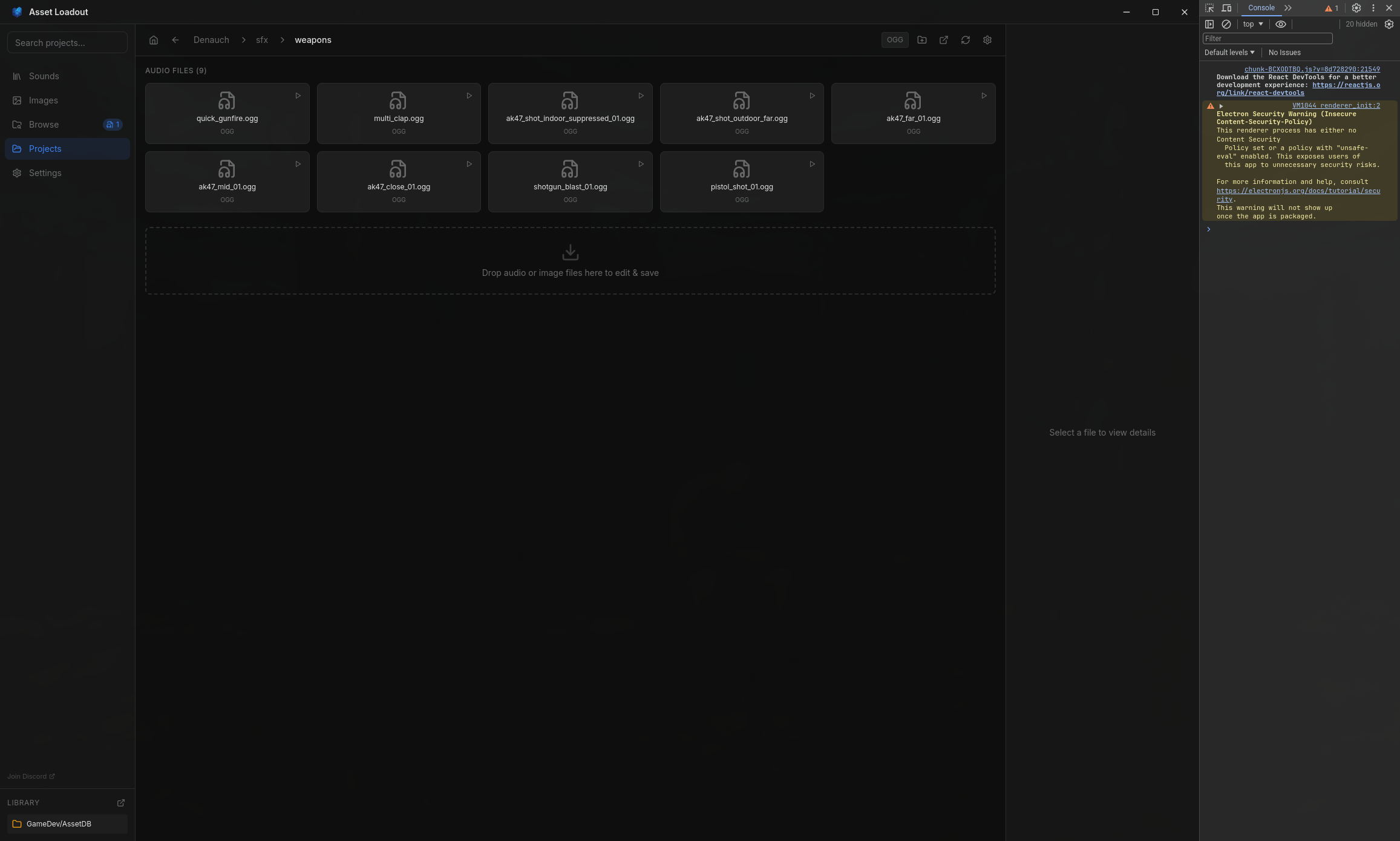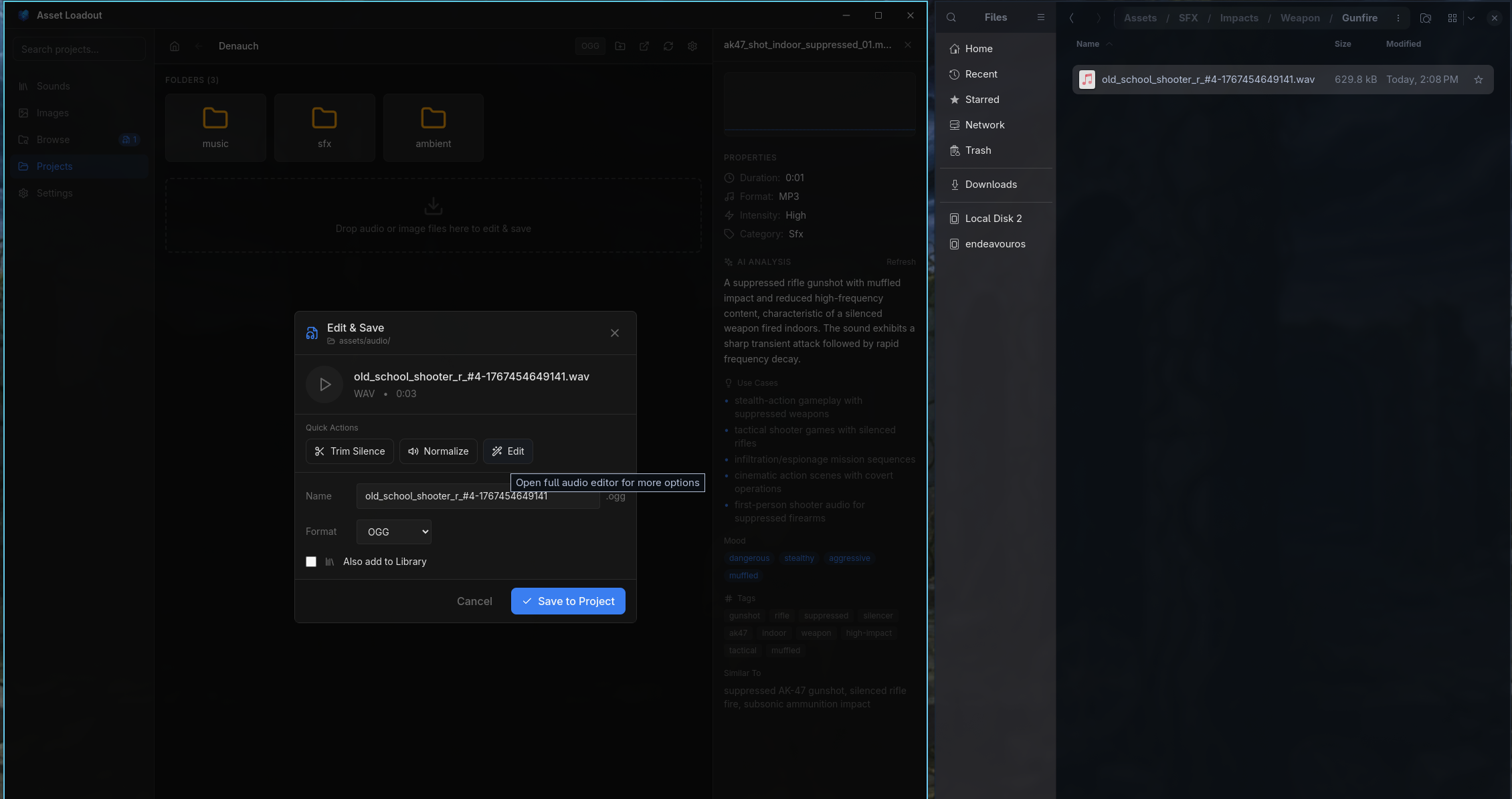 Click any asset to preview it. Use the editing panel to trim audio, adjust images, normalize volume, resize textures, or convert formats - all without leaving the app.