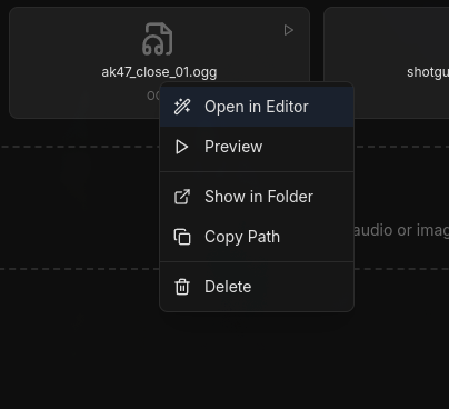 Right-click any folder → "Open in File Browser" to open it in your system's file manager. Drag new assets directly into your project folders.